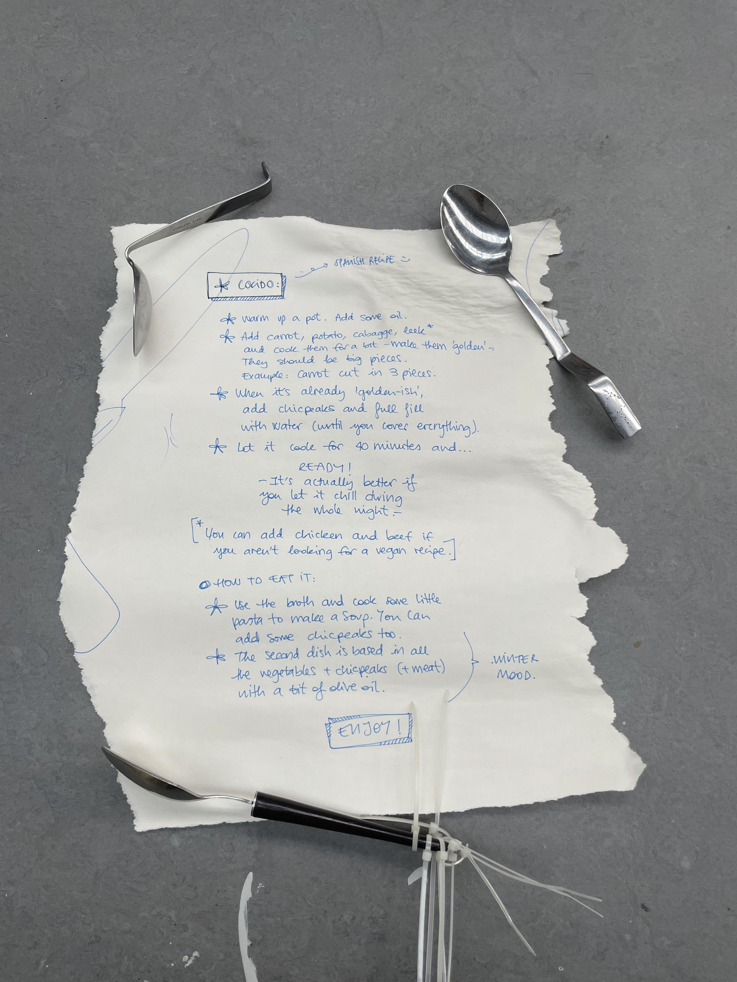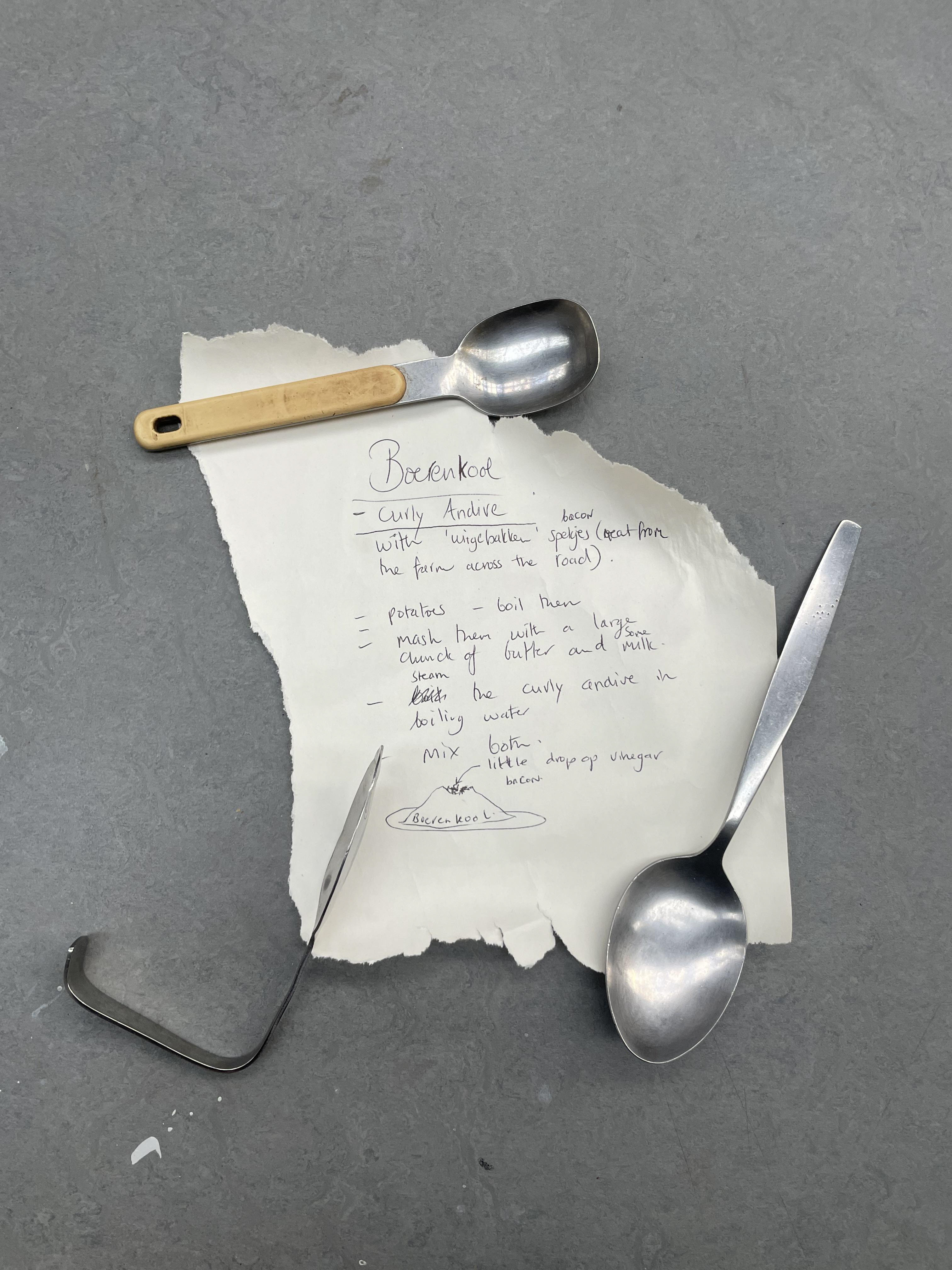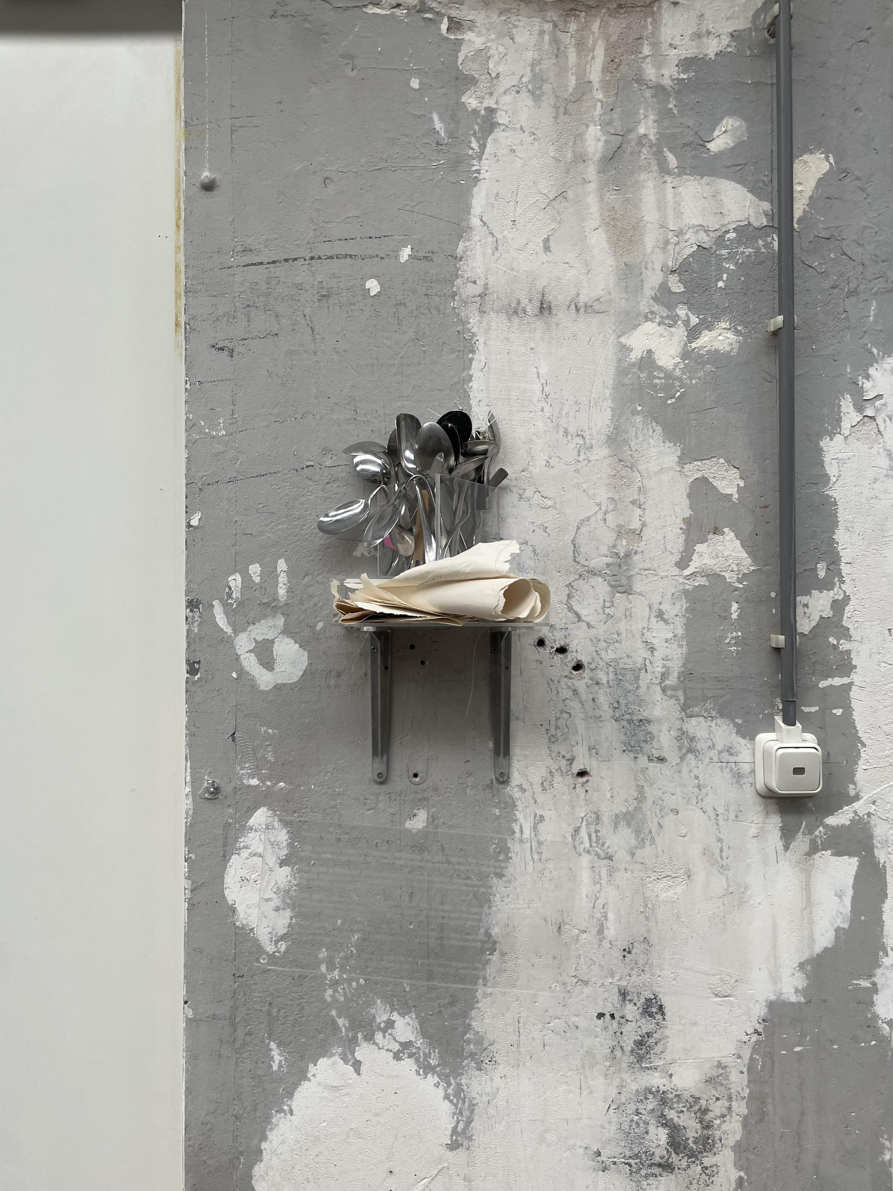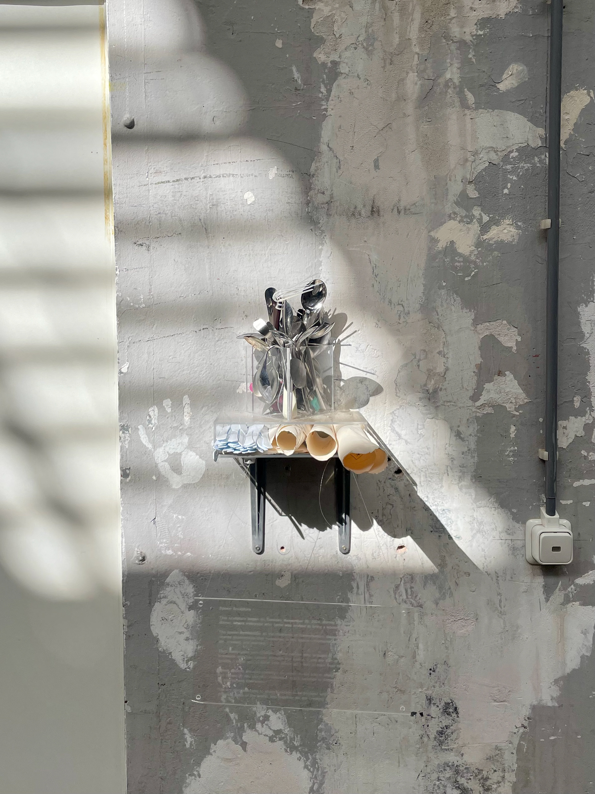 My personal installation invited participants to bring a spoon to leave in the space, a gesture of presence and memory. These spoons now form a communal sculpture that remains in the studio, used daily for lunches and dinners. Over time, this piece continues to grow, as each new generation of scenographers adds their own utensils, expanding the living archive of shared meals and moments.